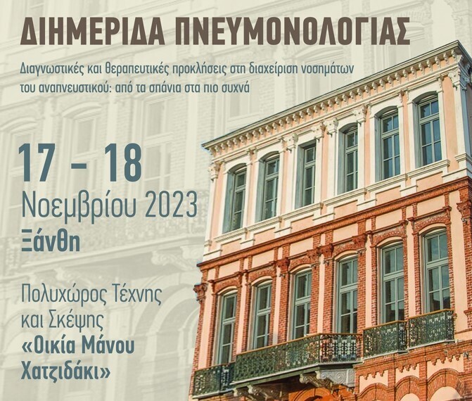 για Διημερίδα Πνευμονολογίας «Διαγνωστικές και θεραπευτικές προκλήσεις στη διαχείριση νοσημάτων του αναπνευστικού: από τα σπάνια στα πιο συχνά», 17 - 18 Νοεμβρίου 2023, Ξάνθη