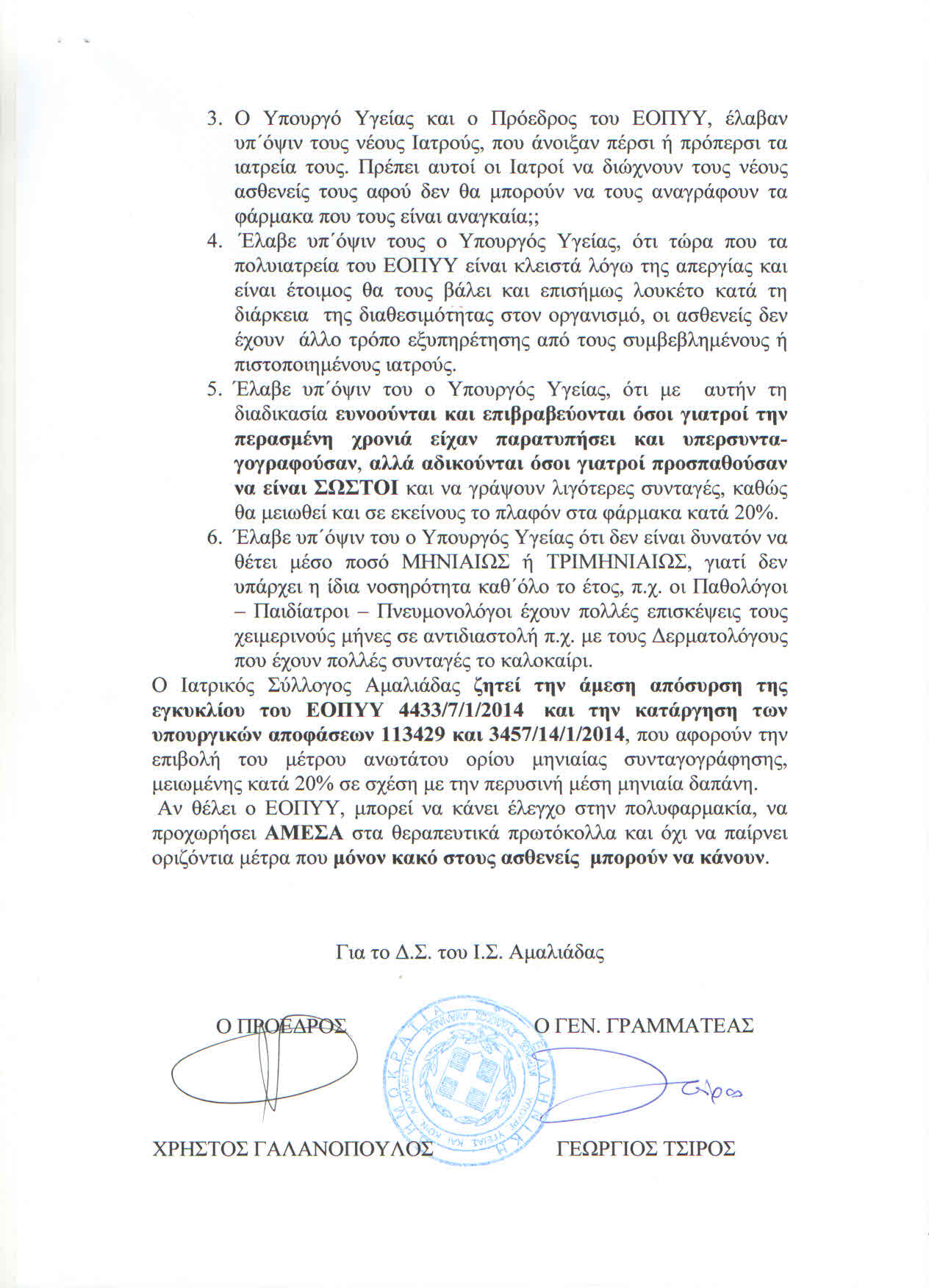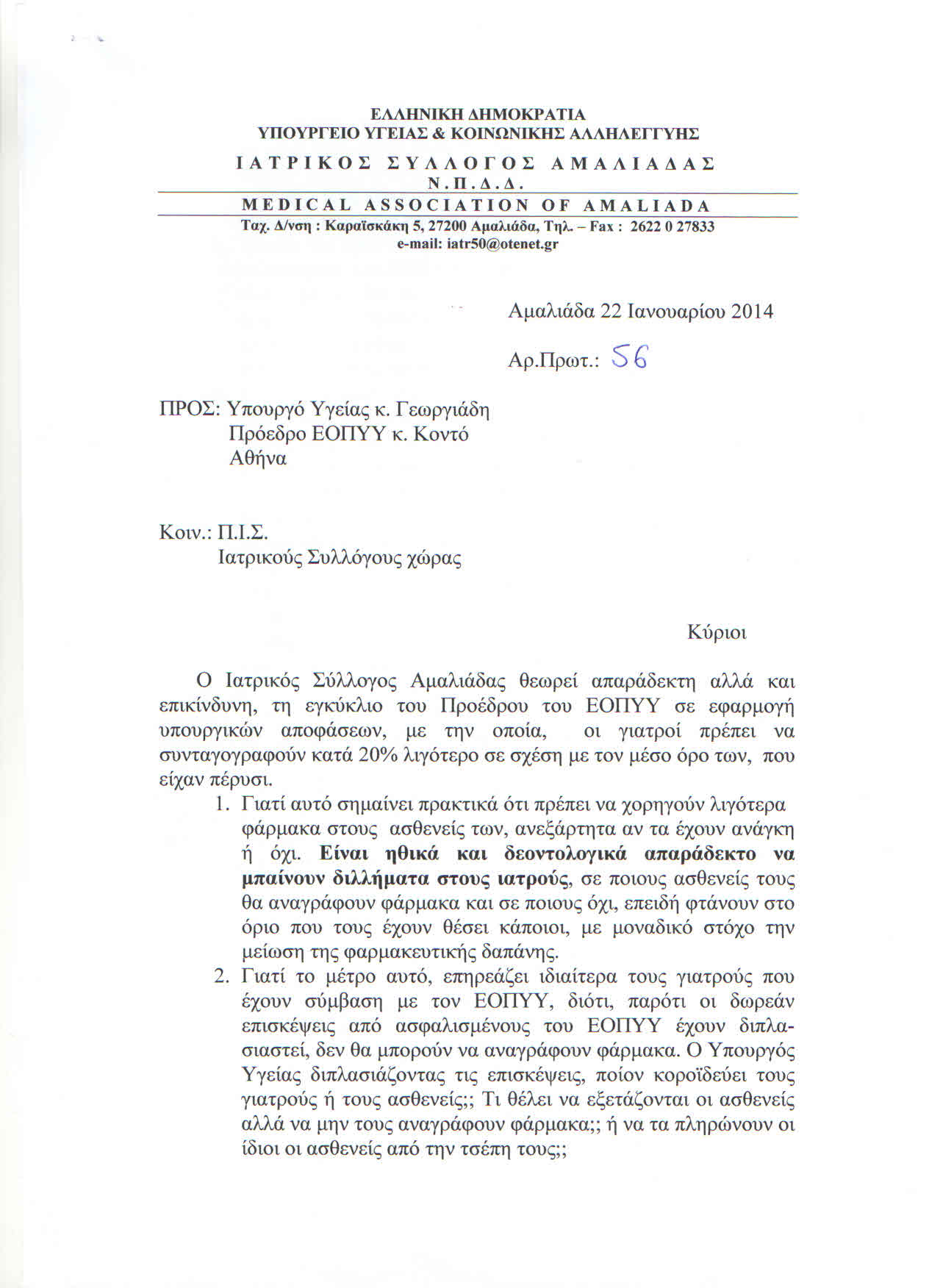 22/1/2014 Ι.Σ.ΑΜΑΛΙΑΔΑΣ ''ΕΠΙΣΤΟΛΗ ΠΡΟΣ ΥΠΟΥΡΓΟ ΥΓΕΙΑΣ & ΠΡΟΕΔΡΟ Ε.Ο.Π.Υ.Υ.''