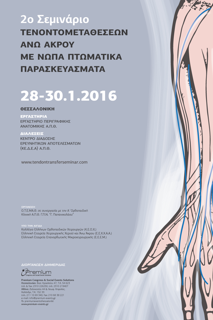 Εκ μέρους της οργανωτικής επιτροπής του «2ουΣεμιναρίου τενοντομεταθέσεων άνω άκρου σε νωπά πτωματικά παρασκευάσματα», το οποίο θα διεξαχθεί στη Θεσσαλονίκη, στις 28-30 Ιανουαρίου 2016, σας επισυνάπτουμε επιστολή-πρόσκληση για τους ορθοπαιδικούς του συλλόγου σας.