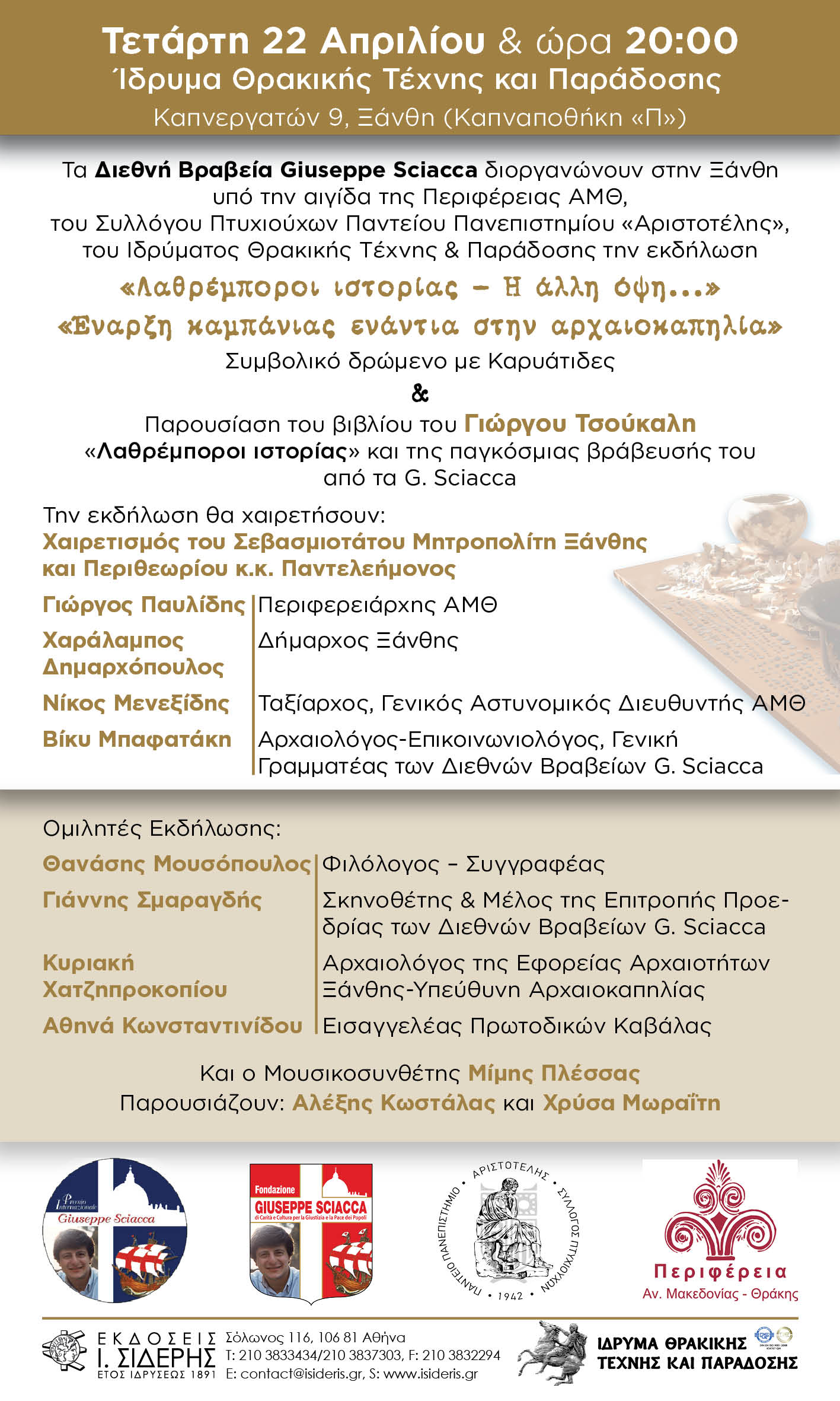 Με αφορμή τη βράβευση του κ. Γιώργου Τσούκαλη, τον περασμένο Νοέμβριο στη Ρώμη, ενός ανθρώπου που μάχεται ενάντια στην αρχαιοκαπηλία τα τελευταία χρόνια, αποφασίσαμε να ξεκινήσουμε μία καμπάνια για την αρχαιοκαπηλία από την Ξάνθη, λόγω της ύπαρξης και των Αβδήρων, ενός τόπου με μεγάλη αρχαιολογική σημασία. Έτσι, την Τετάρτη 22 Απριλίου 2015 στις 20.00 στο Ίδρυμα Θρακικής Τέχνης και Παράδοσης (Καπνεργατών 9 – Καπναποθήκη ¨Π¨) θα πραγματοποιηθεί σχετική εκδήλωση, όπου θα παρουσιαστεί το βιβλίο του κυρίου Τσούκαλη με τίτλο: «Λαθρέμποροι Ιστορίας… η άλλη όψη». Στην εκδήλωση θα συμμετάσχουν διακεκριμένοι άνθρωποι από διάφορους χώρους.