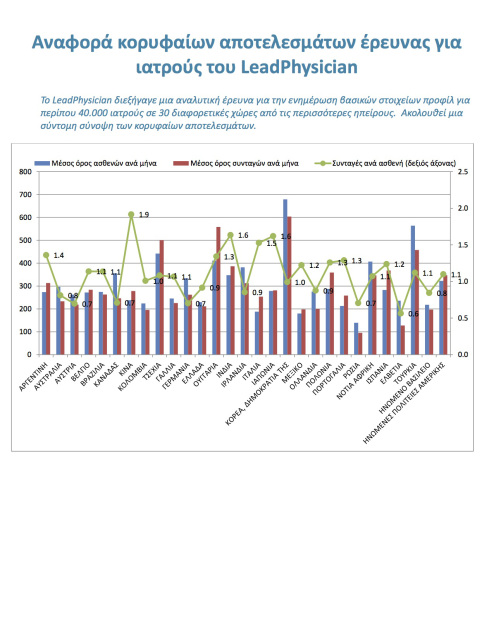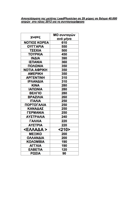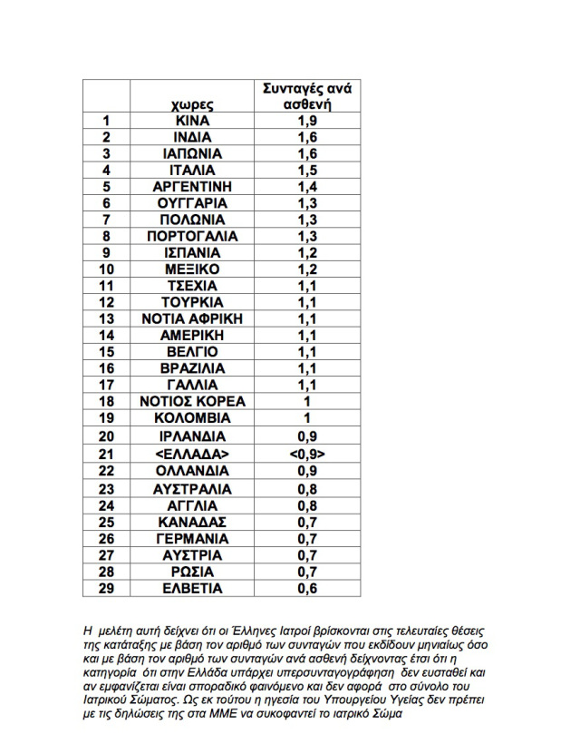 Σε πείσμα όλων όσων κατά καιρούς επιχείρησαν και επιχειρούν να χρησιμοποιήσουν τους Έλληνες Ιατρούς ως βασικό υπαίτιο της υπέρογκης φαρμακευτικής δαπάνης, η Ένωση Ιατρών ΕΟΠΥΥ αποκαλύπτει διεθνή έρευνα από τον μεγαλύτερο οργανισμό παγκοσμίως σε θέματα ιατρικών διαδικτυακών ερευνών (www.leadphysician.com), πουαποδεικνύει με αριθμούς και στοιχεία ότι οι Έλληνες Ιατροί είναι έβδομοι από το τέλος σε μέσο όρο συνταγών (μ.ο συνταγών ανά μήνα 210) μεταξύ 29 χωρών και σε κάθε περίπτωση πολύ πιο κάτω από τον παγκόσμιο μέσο όρο.